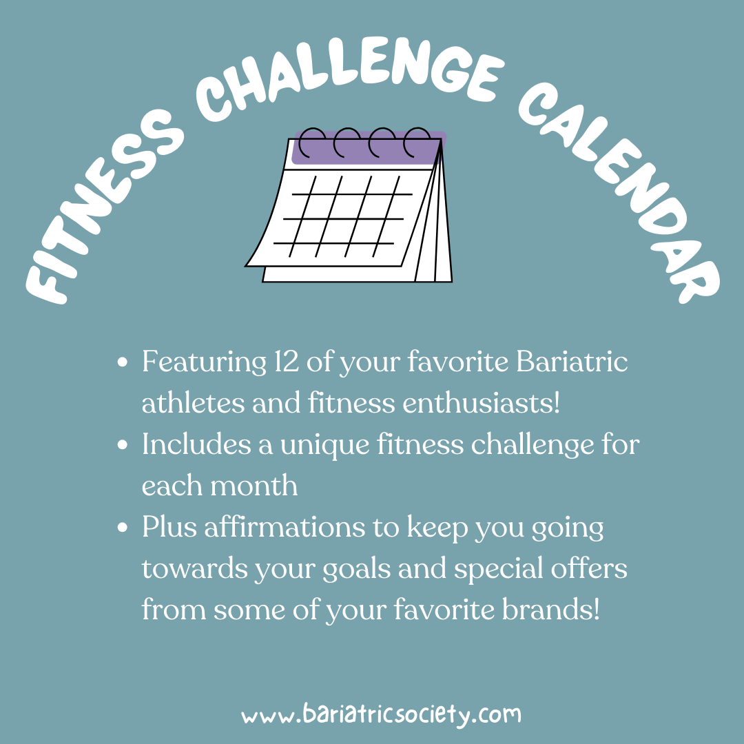 Don’t wait! Grab the digital version of 2025 Fitness Challenge Calendar from Bariatric Society full of awesome photos, affirmations, unique monthly challenges, and special offers! FREE SHIPPING!